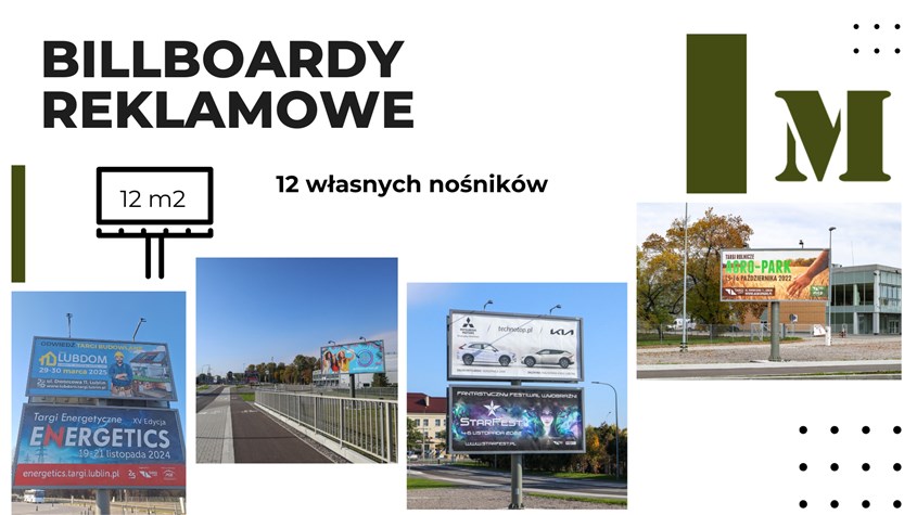 Targi Lublin S.A. dysponują 12 własnymi tablicami billboardowymi. Powierzchnia reklamowa o wymiarze 5,04 x 2,38 m. Tablice są umiejscowione na terenie otwartym. Możliwa ekspozycja reklamy ul. Dworcowej lub ul. Lubelskiego Lipca `80.