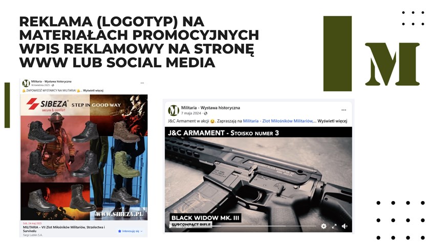 Zaprezentuj swoje treści na stronie internetowej MILITARIÓW w zakładce aktualności, na mediach społecznościowych Targów Lublin lub wyeksponuj swój logotyp na materiałach promocyjnych wydarzenia.