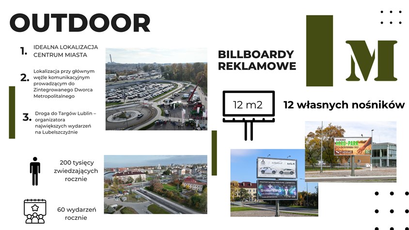 Targi Lublin S.A. dysponują 12 własnymi tablicami billboardowymi. Powierzchnia reklamowa o wymiarze 5,04 x 2,38 m. Tablice są umiejscowione na terenie otwartym. Możliwa ekspozycja reklamy ul. Dworcowej lub ul. Lubelskiego Lipca `80.