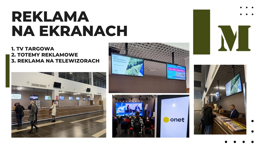 Wyświetlenie materiału reklamowego podczas trwania MILITARIÓW (120 emisji x 15s/dzień) na ekranach usytuowanych przy głównym wejściu, na totemach reklamowych umieszczonych przed wejściem do sali konferencyjnej oraz na telewizorach wyeksponowanych w hali np. w strefie gastronomicznej.