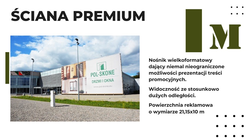 Ściana PREMIUM Targów Lublin to nośnik wielkoformatowy dający niemal nieograniczone możliwości prezentacji treści promocyjnych. Jest widoczny z dużych odległości.